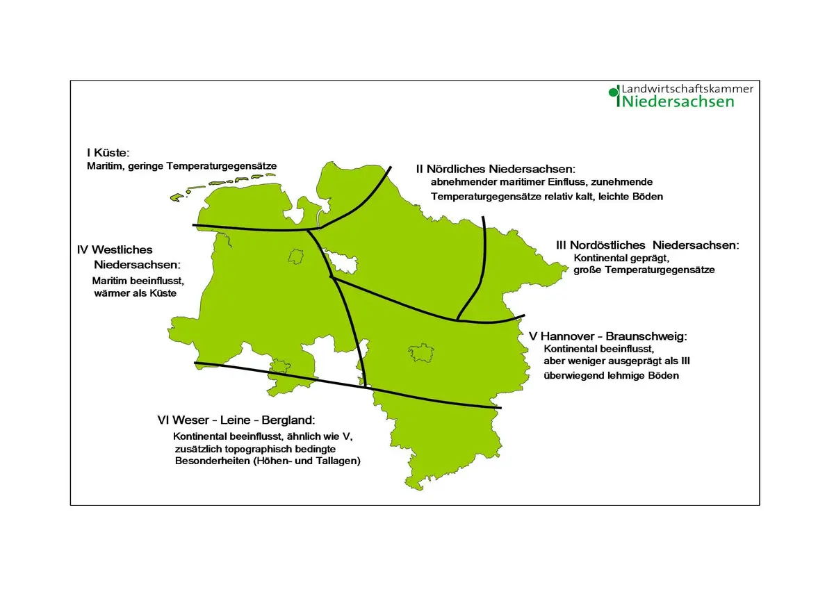 Niedersachsen wird in sechs phänologische Klimaregionen unterteilt, die wir für unsere Mitteilung nutzen, da vergleichsweise einheitliche Wirkungen der Witterung innerhalb dieser Regionen vermutet werden. Weil neben dem Wettergeschehen auch Standortfaktoren wie Höhenlage, Bodentyp und Exposition eine Rolle spielen, ist auch innerhalb der Regionen mit Unterschieden zu rechnen. Die korrigierten Temperatursummen in den Klimaregionen sind als Mittelwerte mehrerer DWD-Stationen dargestellt. Besondere Bedingungen können daher zu deutlichen Abweichungen führen.