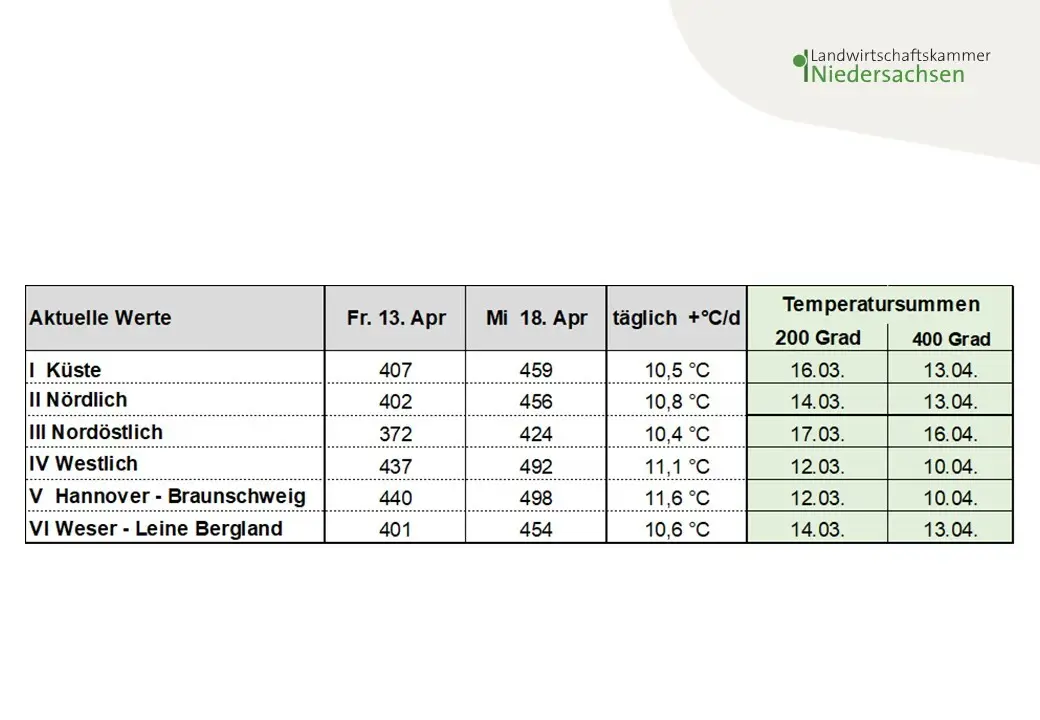 Es wird nun in allen sechs Klimaregionen (Abbildung 3) von Niedersachsen die korrigierte Temperatursumme 400 Grad erreicht (Tabelle 1). Die regionalen Unterschiede der Temperatursumme zeigen bis zu eine Woche spätere Entwicklung im nordöstlichen Niedersachsen (16. April) gegenüber den deutlich milderen Regionen Westliches Niedersachsen und Hannover Braunschweig (10. April) auf.