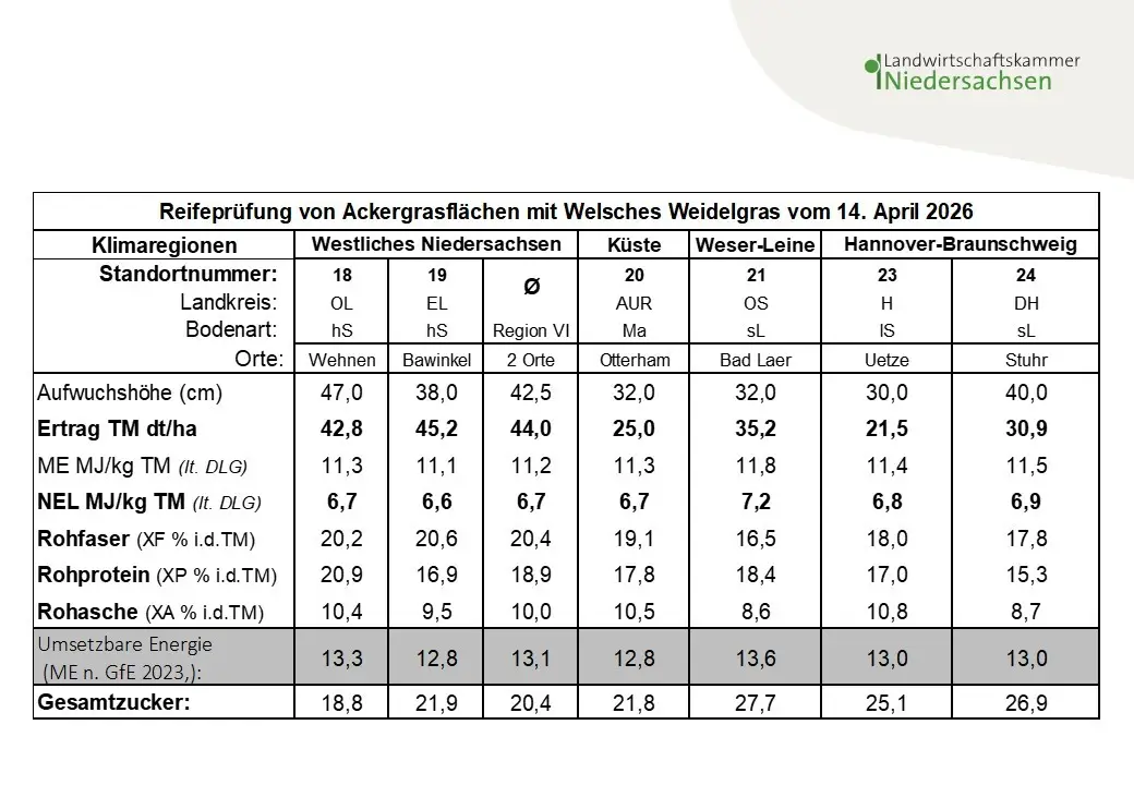 Probeschnitte wurden am 14. April von drei Standorten im westlichen Niedersachsen sowie jeweils einem Standort in den Klimaregionen Küste (Otterham), Weser-Leine Bergland (Bad Laer) und Hannover-Braunschweig (Stuhr) genommen und im Institut für Futtermittel der LUFA Nordwest mit der NIRS-Methode hinsichtlich Trockenmasse und Inhaltsstoffe (Tabelle 2) untersucht.