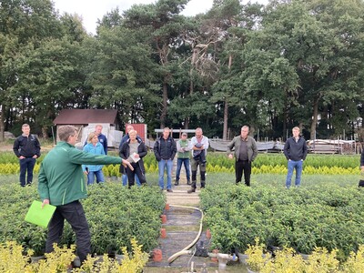 Im Anschluss fuhren alle Teilnehmenden von Edewecht weiter in die Gemeinde Apen zum Jungpflanzenbetrieb Jens Meyer. Hier werden hochwertigen Koniferen-Veredelungen und Jungpflanzen wie Blütensträuchern, Heidelbeeren, Moorbeetkulturen etc. produziert. Jens Meyer setzt bereits seit vielen Jahren auch stärker torfreduzierte Substarte ein, sodass alle unterschiedlichsten Kulturen im Betrieb in verschieden Substraten mit max. 50 % Torf kultiviert werden – und das ohne größere Probleme. „Ich musste in diesem Jahr deutlich häufiger flüssig nachdüngen. Die Substratpreise sind sehr hoch. Auf kostspielige Substratausgangsstoffe wie Kokosmark kann man im Jungpflanzenbereich und bei stark torfreduzierten Substraten nicht verzichten. Vor allem in Baumschulen mit Großcontainern werden die erhöhten Kosten zu Buche schlagen.“, so Jens Meyer.