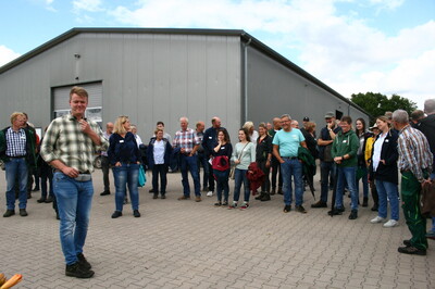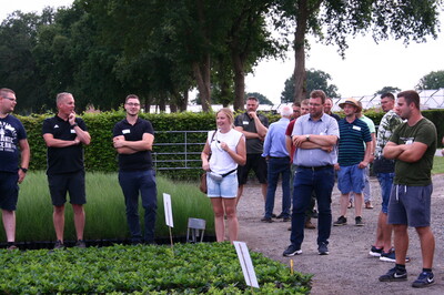 Die Baumschule Hülsmann produziert auf über 20 ha in Edewecht eine Vielzahl von Kulturen, darunter Heckenpflanzen, Sträucher, Blütensträucher und Gräser im Container. Auf Anhängern sitzend wurden die Teilnehmenden durch den Betrieb gefahren, dabei gaben Gerd und Sohn John Hülsmann Einblicke in ihre Produktion.