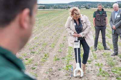 Zu den vom Ministerium mitfinanzierten, hochmodernen Technologien, die dort unter betrieblichen Bedingungen eingesetzt und geprüft werden, gehört ein digitaler Analyse-Spaten, der in Echtzeit wichtige Bodenparameter liefert, etwa den Nährstoff-, den Humusgehalt sowie den pH-Wert. Eine kameragesteuerte Hacke, die nicht nur zwischen den Reihen der gepflanzten Kultur, sondern auch in der Reihe zwischen einzelnen Pflanzen Un- und Beikräuter beseitigt, konnte die Ministerin beim Einsatz in einer Versuchsparzelle beobachten. „Verfahren zur mechanischen Unkrautbekämpfung spielen eine wichtige Rolle, wenn es künftig darum geht, mit weniger Pflanzenschutzmittel zu arbeiten", fasste Jobst Gödeke, Leiter des PraxisLabors, die Funktion des Geräts zusammen.
