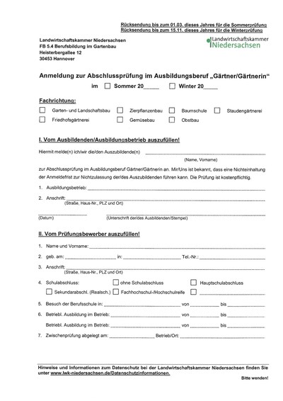 Die Abschlussprüfungen im Gartenbau finden in Niedersachsen zweimal jährlich statt. Die Termine sind jährlich in etwa gleichbleibend (vorbehaltlich organisatorisch notwendiger Änderungen). Die Winterprüfung findet im Januar /…
