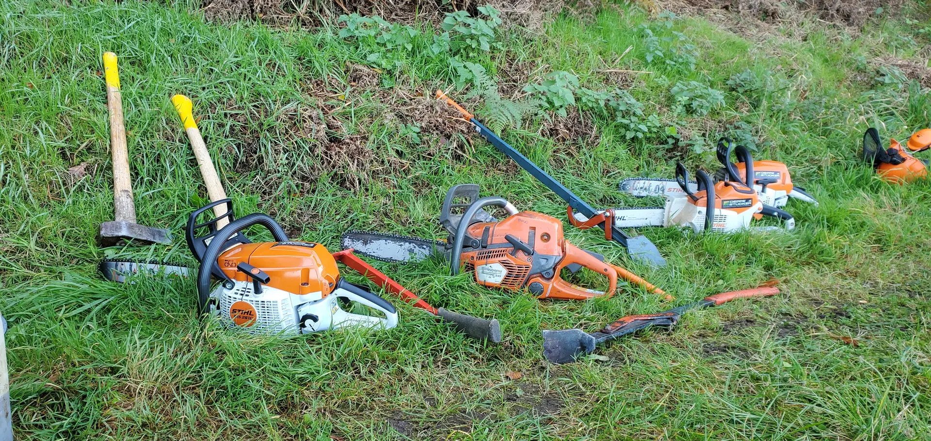 Motorsägen und alle notwendigen Werkzeuge für den praktischen Lehrgangsteil werden zur Verfügung gestellt. Eine eigene Motorsäge kann mitgebracht werden, sofern sie mit entsprechenden Betriebsstoffen (biologisch schnell abbaubare Kettenhaftöle sowie Sonderkraftstoffe) betrieben wird.